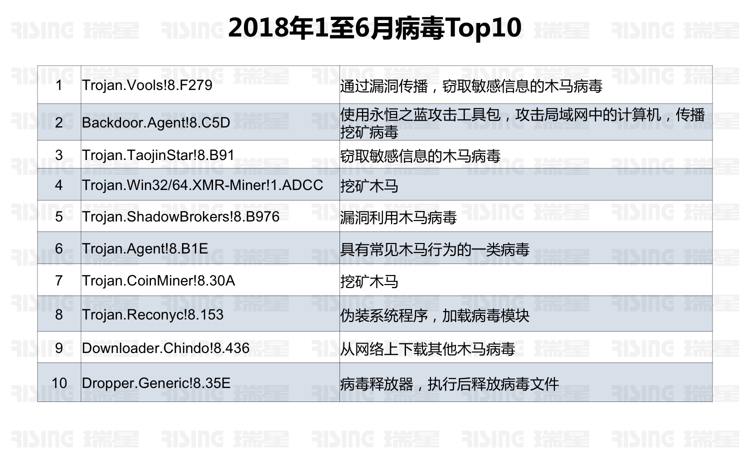 全球快要5万家网坐被者植入挖矿脚本,通过对瑞星捕捉的样本按平台阐发发觉,瑞星评选出了2018年上半年1至6月病毒Top10:演讲期内。